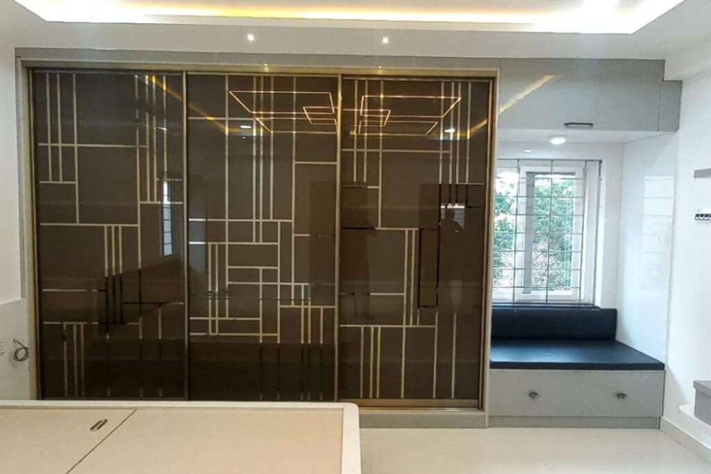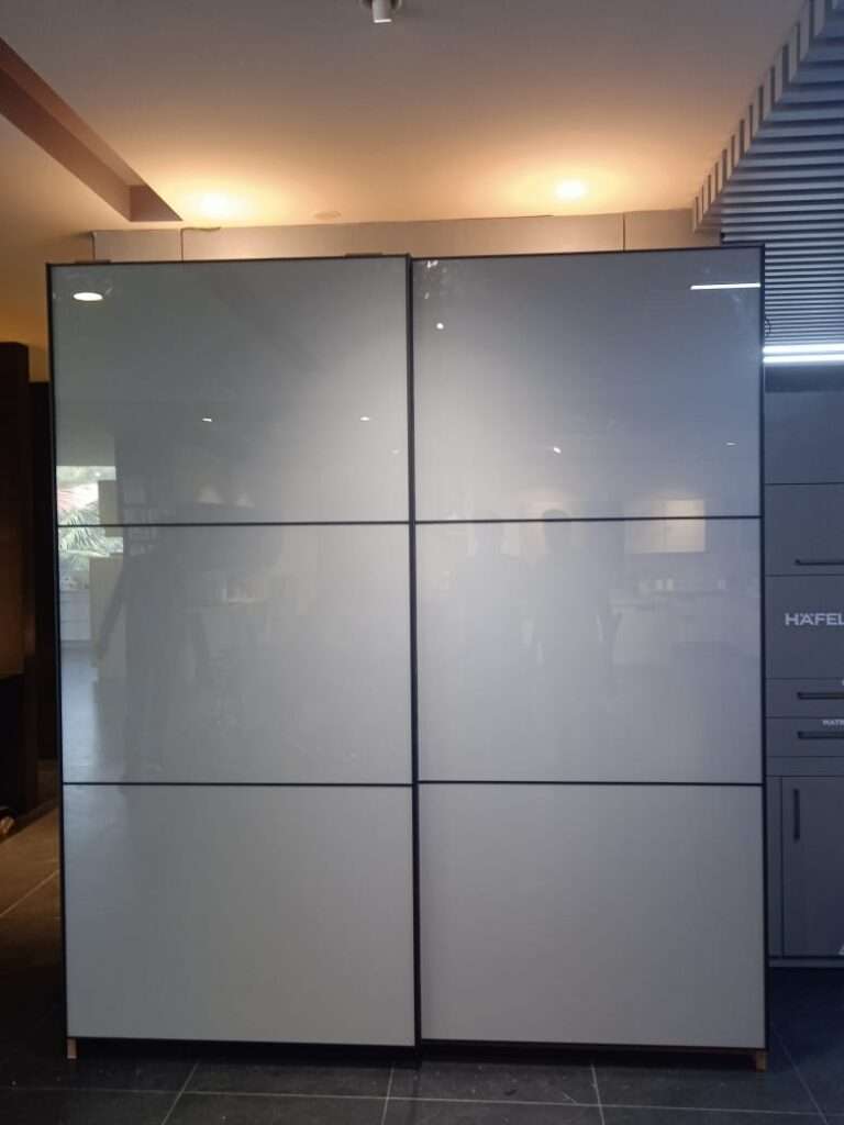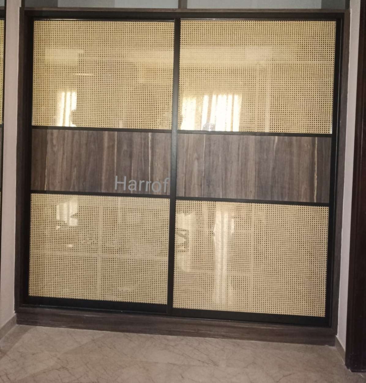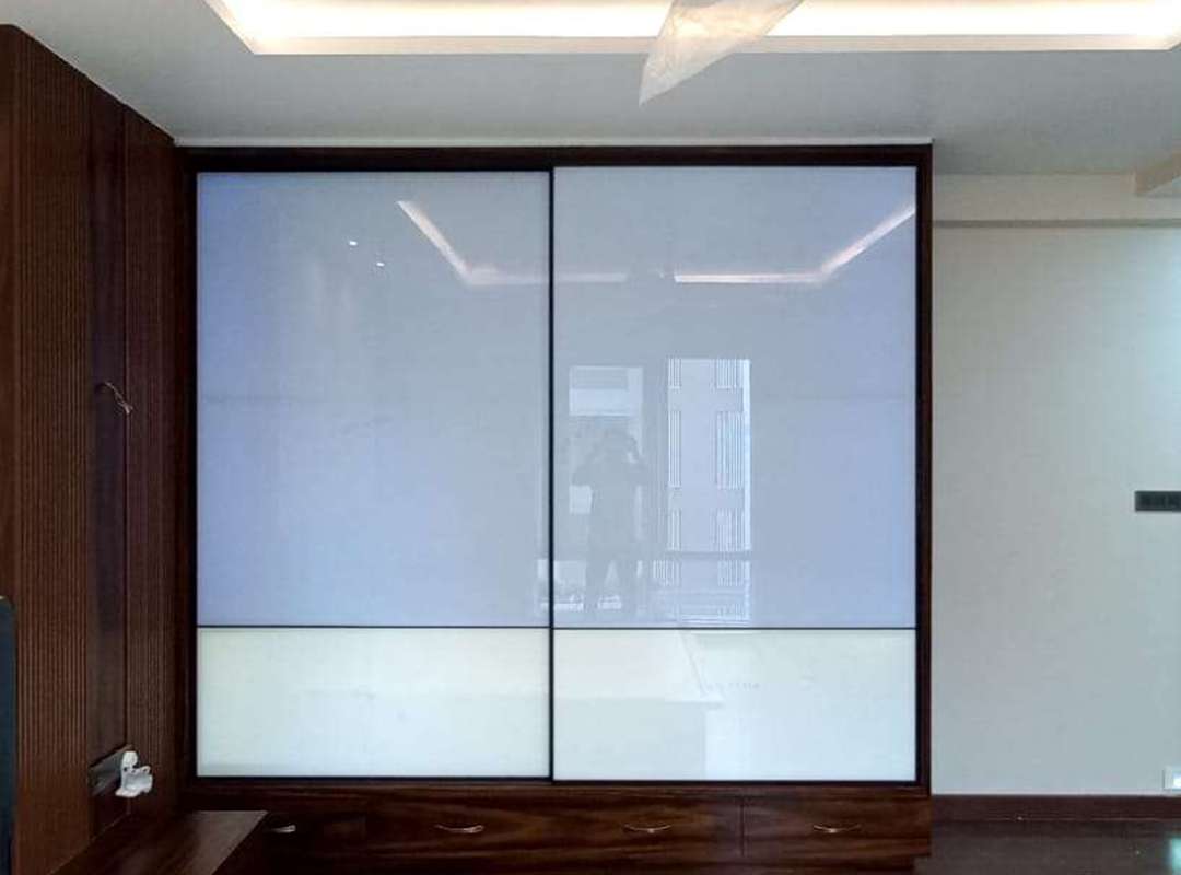 Profile is Made up of Aluminium Anodised Coated Material, Top and Bottom Track is made with Aluminium. sandwich glass with wooden mosh. with laminate finish. It work with Soft closing.